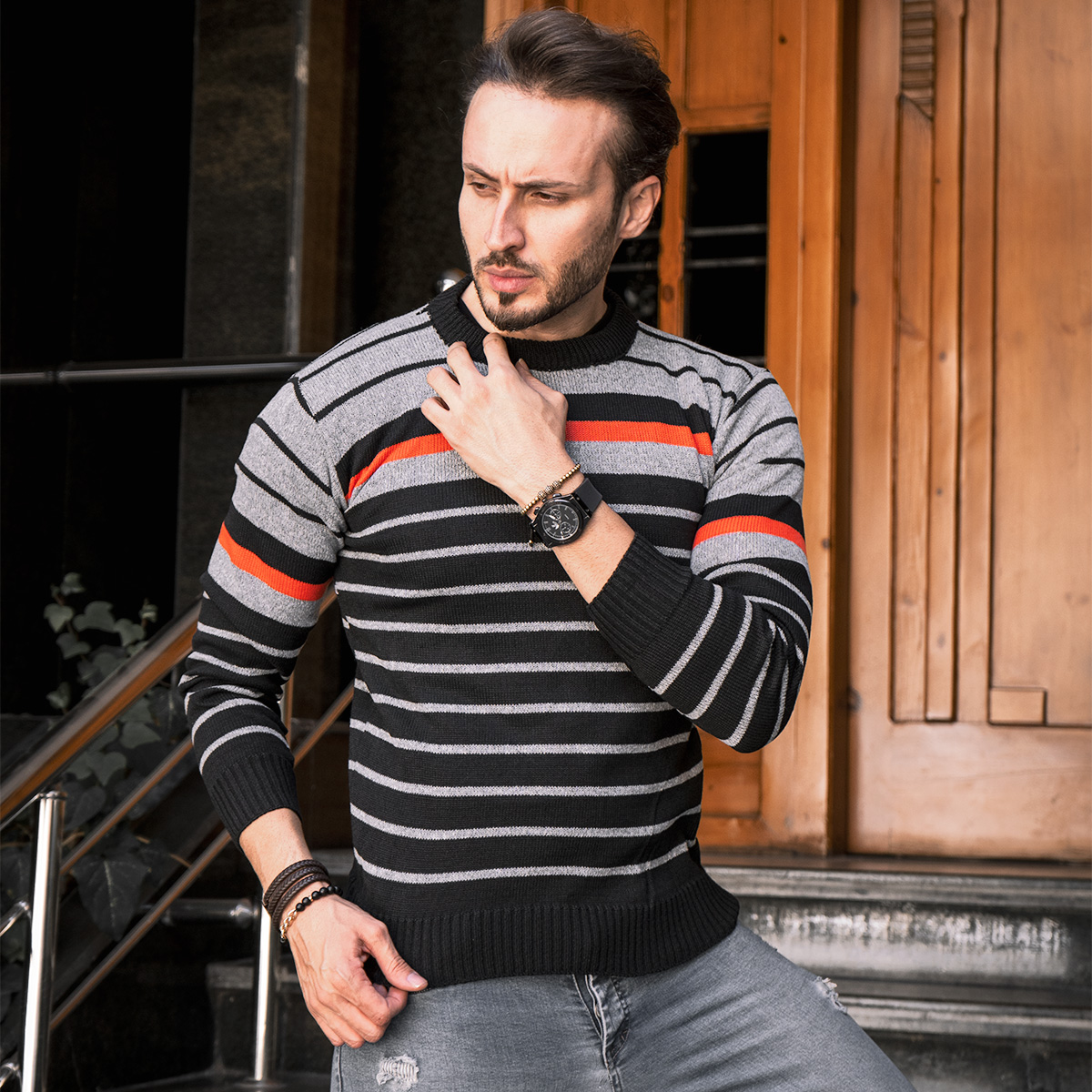 پلیور بافت راه راه طوسی مشکی مدل Hami